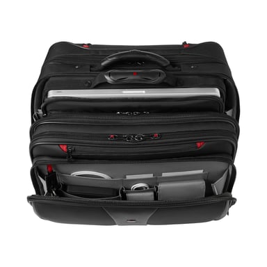 Trolley 17″ robuste, sacoche 15.6″ amovible, design professionnel, mobilité fluide, protection renforcée – l’ensemble Wenger PATRIOT est votre allié business.